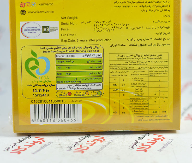 پولکی رژیمی کامور Kamvar با طعم زنجبیل، بدون قند اما شیرین میباشد و از ایزومالت که از چغندر گرفته شده است بعنوان شیرین کننده استفاده شده است که کالری آن نصف کالری شکر است و همچنین از پوسیدگی دندان جلوگیری کرده و مناسب برای افراد عادی، دارای رژیم و دیابتی میباشد.